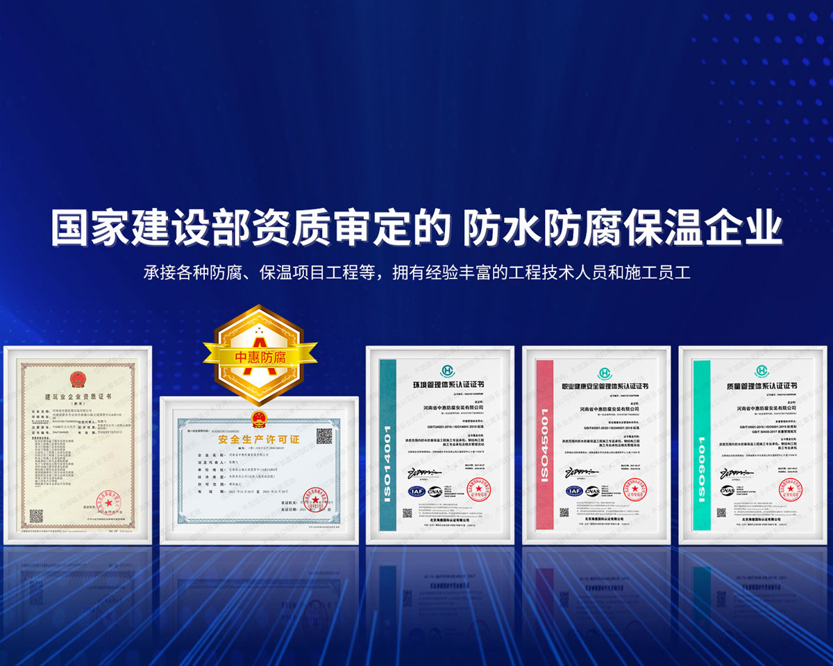 公司經營范圍:防水防腐保溫工程;消防設施工程;建筑裝修裝飾工程;建筑機電安裝工程;電力工程;建筑工程;石油化工工程;工業清洗工程;油罐清洗工程;鋼結構工程;環保工程;模板腳手架工程;電纜防火封堵、防污閃噴涂、外墻外保溫工程;各類施工勞務作業;設備維修、船舶鉚焊、涂裝;電力工程材料、建材、防水材料、防火材料、防腐保溫材料銷售,并相繼通過了GB/T19001-2008idtISO9001:2008GB/T50430-2007質量管理體系認證證書。GB/T24001-2004idtISO14001:2004環境管理體系認證證書。GB/T28001-2011idtOHSAS18001:2007職業健康安全管理體系認證證書。公司是中國防腐蝕于防護協會、中國施工企業管理協會、電力協會和中國鋼結構防水協會會員單位?! 」镜慕洜I業務涵蓋了石油、化工、電力、冶金、煤炭、船舶、國防、燃氣、水利、環保、交通運輸、航空及國防軍工和輕紡市政等行業的防腐保溫絕熱設備。鋼結構安裝、防火、防水、金屬噴鍍、聚脲噴繪、陰極保護、防滲透堵漏、玻璃鋼及各種磚版材料襯里、橡膠襯里、煙氣硫和耐酸溶劑腐蝕等工程施工。公司連續十年榮獲“省市先進施工企業”“安全生產先進單位”“重合同,守信用企業”和“AA***資質企業”的稱號。2000年被命名為市級文明單位,2002年被國家工商行政管理局命名為“重合同,守信用的企業”、被中國工業防腐蝕技術協會命名為“防腐蝕企業,能源節約及環境保護領域有豐富的經驗和***的業績。工程一次交驗合格率100%。其中攀枝花鋼鐵公司煉鐵廠四號高爐及熱風爐防腐工程、上海寶鋼公司煤氣柜防腐工程、撫順石油一廠裝置防腐項目、齊魯石化公司稀烴廠高塔防腐工程、吉林化學工業公司煉油廠油罐防腐工程、天津石化熱電廠六號爐頂棚聯絡管保溫工程、大慶油田(太倉)力神泵業工程、中國化學工程第十一建設工程、中原油田勘探局工程、中國石化銷售有限公司華北分部、魯皖輸油管道工程、貴州開磷息烽合成氨工程、陜西黃陵煤化工程、中國石油天然氣西部管道塔里木輸油工程、邯鋼集團邯寶鋼鐵公司煉鐵工程、德州供電工程、吉寶(南通)船廠工程,偃師華潤熱力工程、鄭州熱力總公司?! 『幽鲜≈谢莘栏惭b有限公司愿以豐富的施工經驗,***的技術,***的設備,***的管理,***的服務,竭誠為國內外廣大的用戶提供***滿意、******的工程作品。 我公司愿與國內外同仁一道,團結協作,共同推進防腐蝕行業發展! 公司地址:河南省長垣縣建設路北段360號 固定電話:0373-8866488 郵編:453400 網址:http://www_zhff_com_cn.iwenche.com